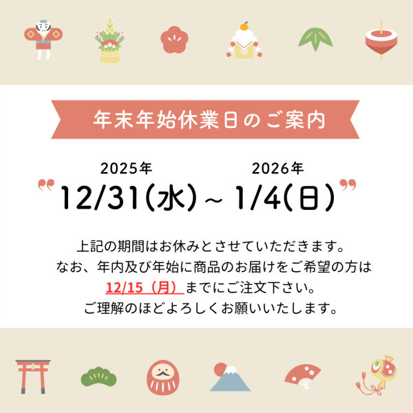 なお、年内配送につきましては12/15(月)までの受付とさせていただきます。